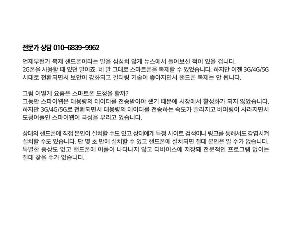 문제를 해결할 수 있는데 도움이 되고, 궁금한 점이 있다면 지금 바로 문의해 보세요. 전화, 호신캠의 카톡, 실시간 채팅 등으로 문의하시면 친절히 도와드릴게요. 개인정보 유출 방지를 위한 유용한 팁과 함께 스마트폰 도청 징후를 빠르게 식별하여 안전하게 보호받으세요.